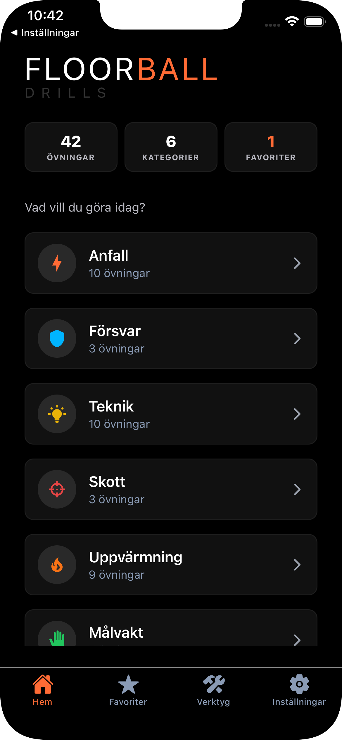 Appen innehåller just nu 42+ övningar inom kategorier som anfall, försvar, teknik, skott, uppvärmning och målvakt. Nya övningar läggs till löpande.